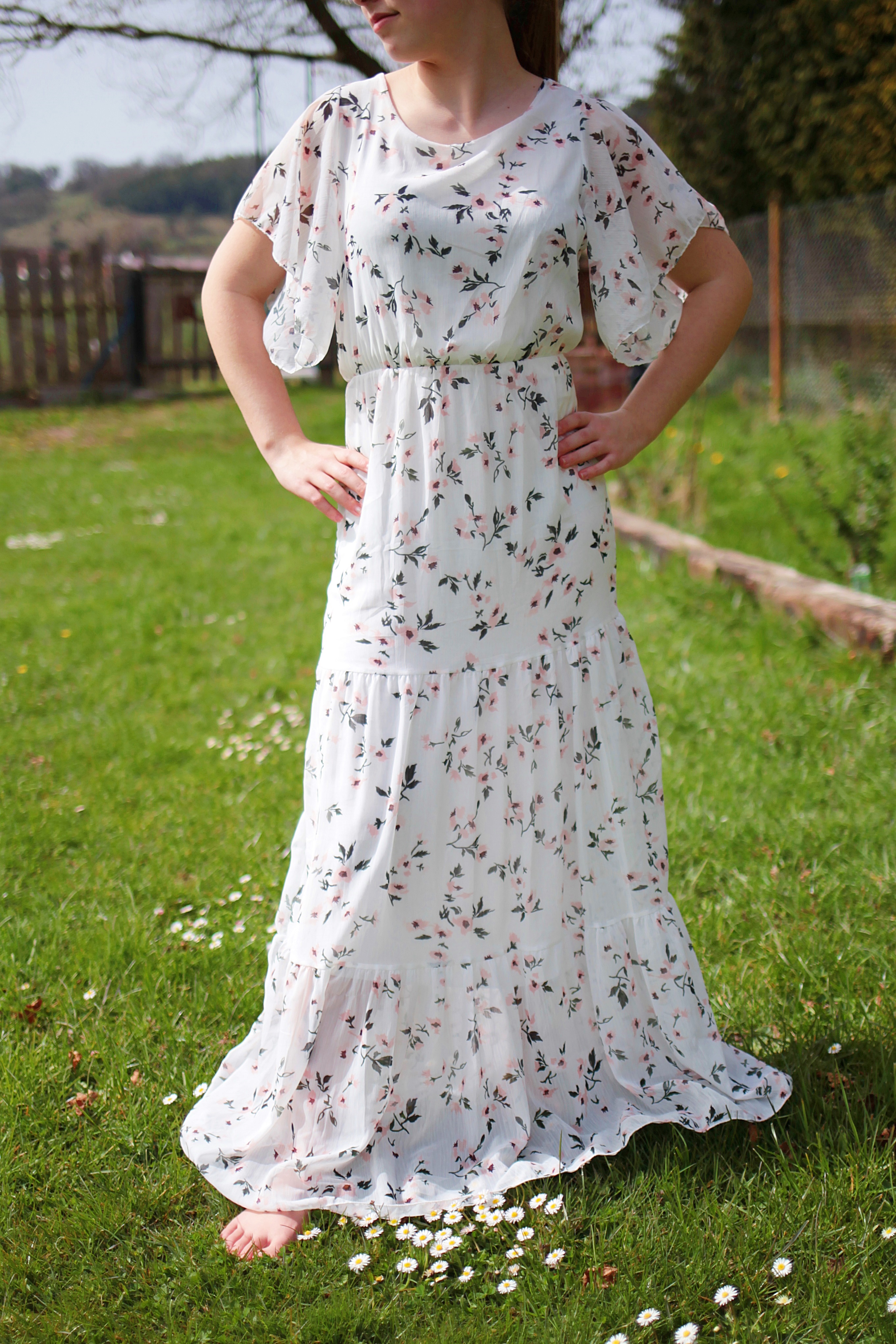 Langes Kleid mit wundervollem Blumenmuster und schmeichelhaften Ärmeln.