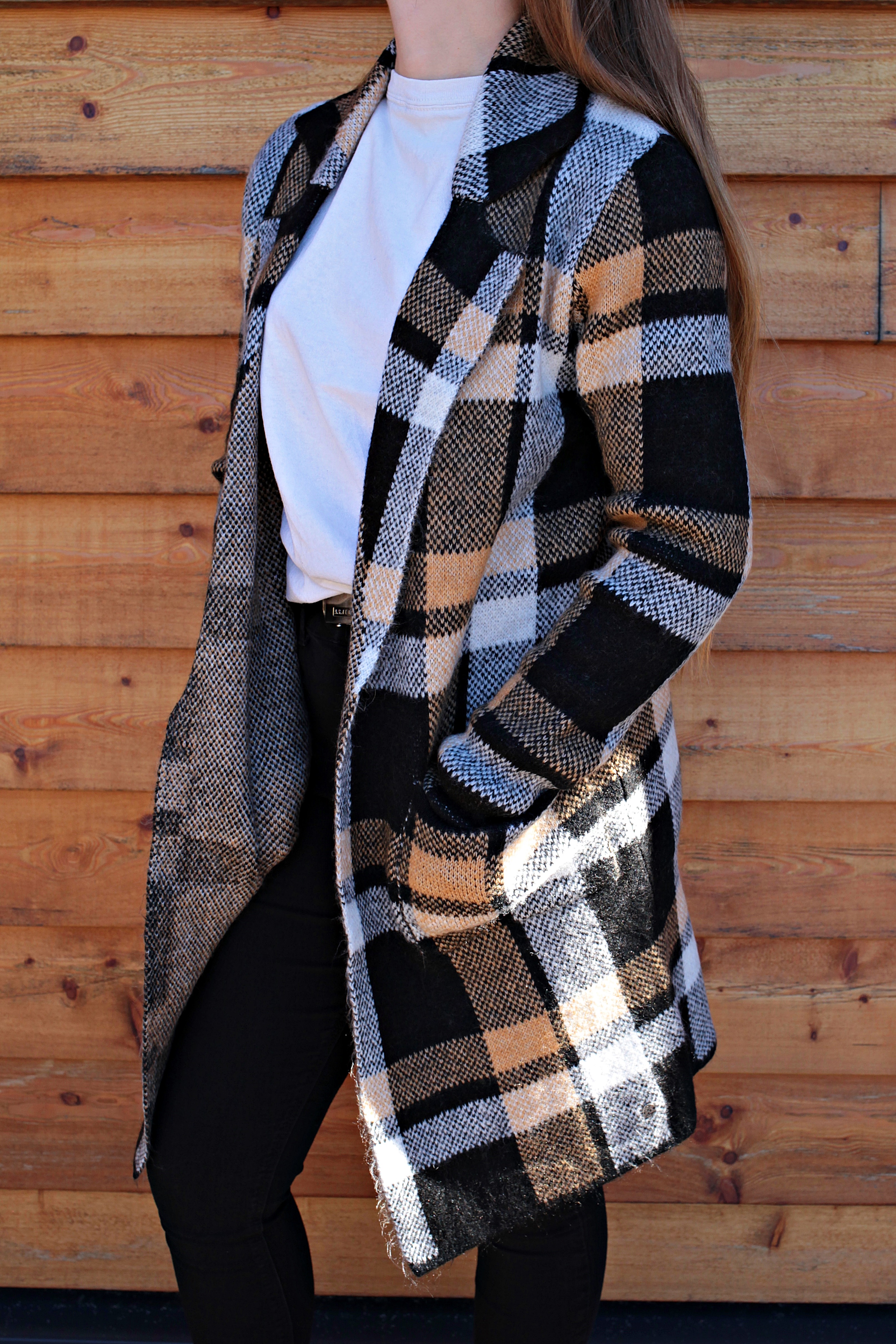 Karierter Mantel ohne Knopf in zahlreichen Größen verfügbar.